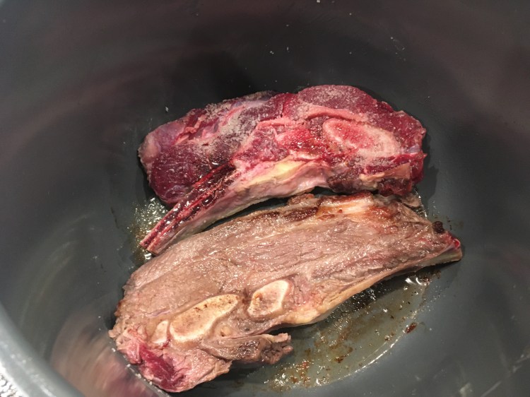 - Instant Pot: Lightly oil the bottom of the pot and hit “sauté.” Sear the bones, turning to brown on all sides.