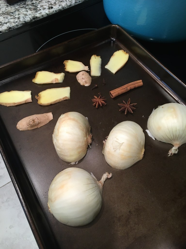 At the same time, on another pan, roast the halved onions, open side down. Also roast the star anise, cloves, cinnamon stick and ginger on this pan. Roast until all begins to brown and becomes fragrant (about 10 minutes).