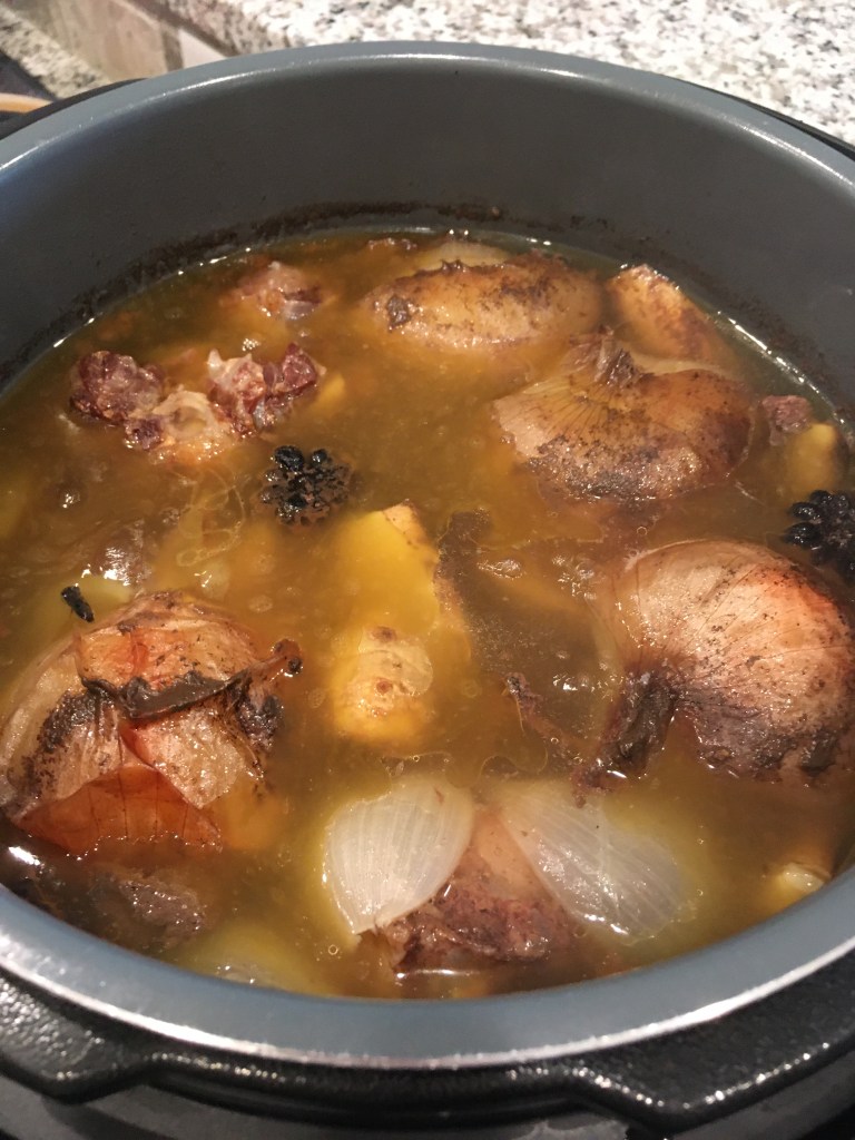 Add the roasted bones, onions, and spices to a stock pot or instant pot. Pour the water over all ingredients. Add salt. If using a stock pot, bring to a boil and then simmer for 8-10 hours. If using an instant pot, pressure cook for 1 hour.