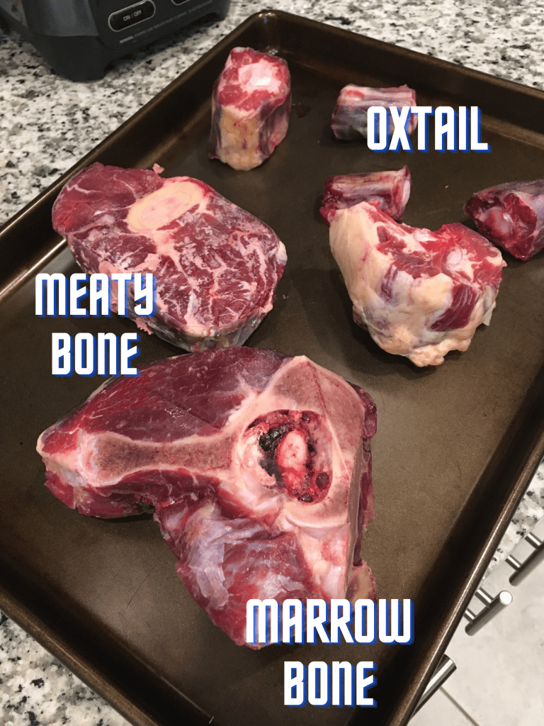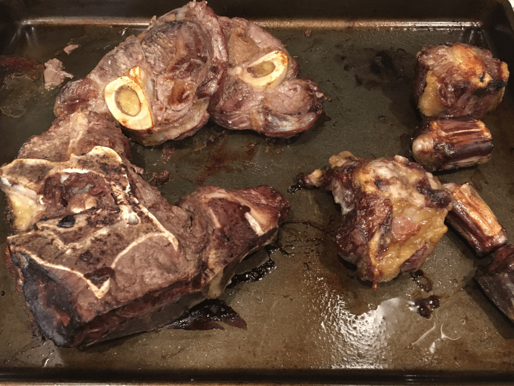 Place all of the bones on a roasting pan. Roast at 425 until the bones and meat begin to brown (about 15 minutes). Flip the bones and roast the other side (about 5 minutes).