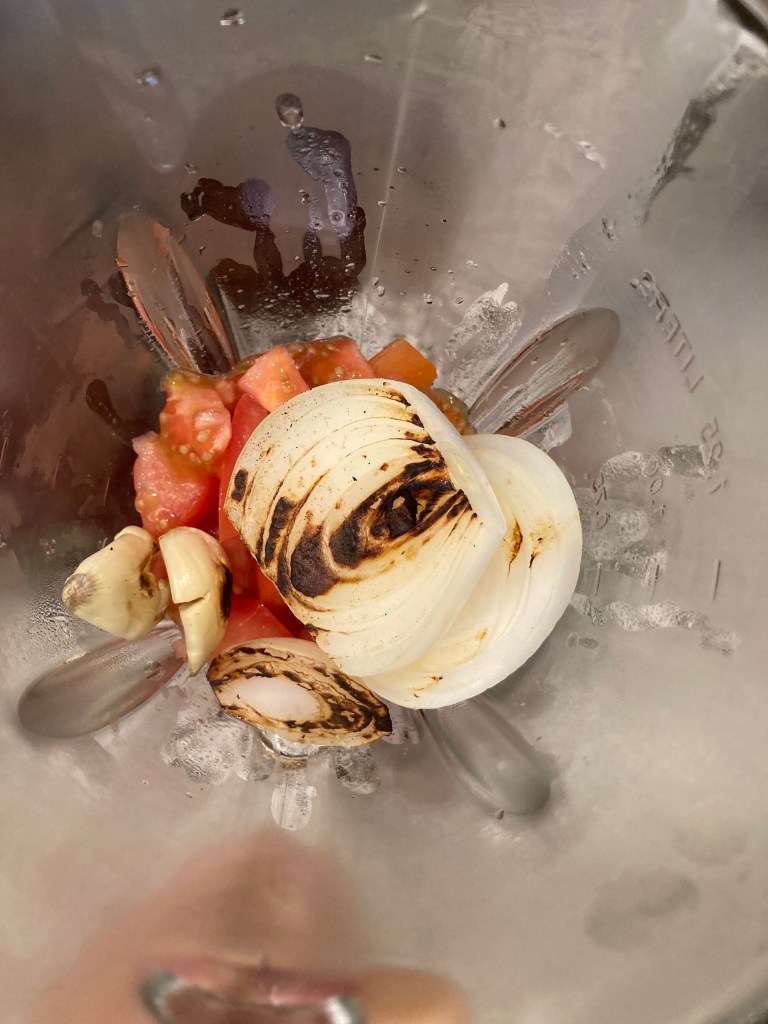 While the Guajillo peppers are simmering in hot water, roast the garlic and onion, then add all remaining ingredients to a blender.