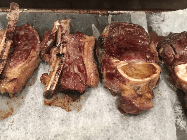 To get the richest, most pleasing flavor, roast the bones in the oven for about 30 minutes at 425 on a parchment lined, rimmed pan. They are done when they are brown with a caramelized appearance.