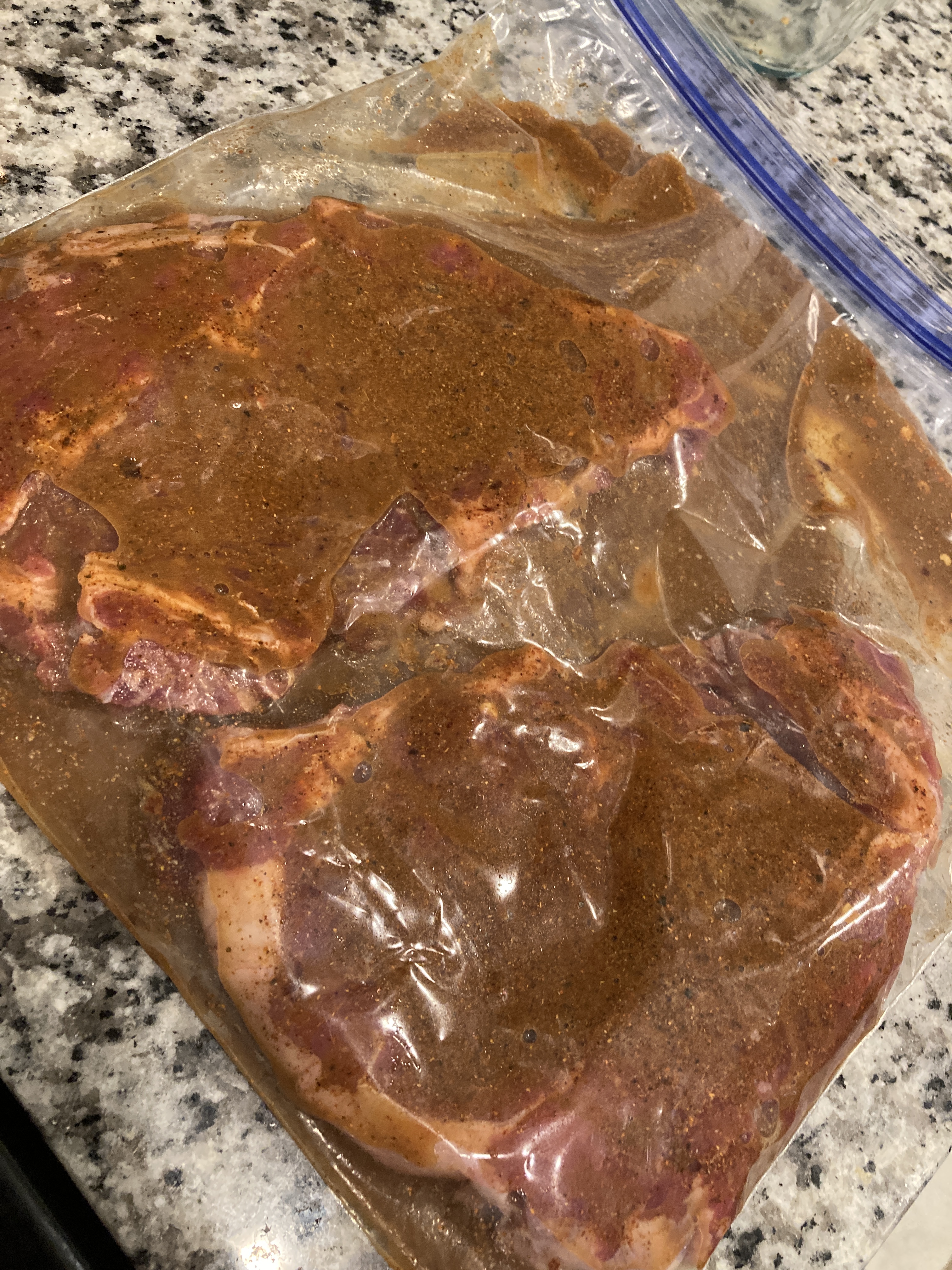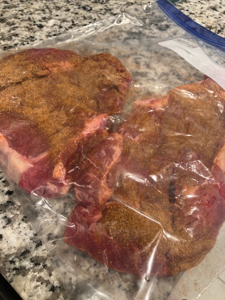 3. Pour the remaining dry ingredients over both sides of the steaks. With hands outside the ziplock bag, massage the dry ingredients into the steaks.