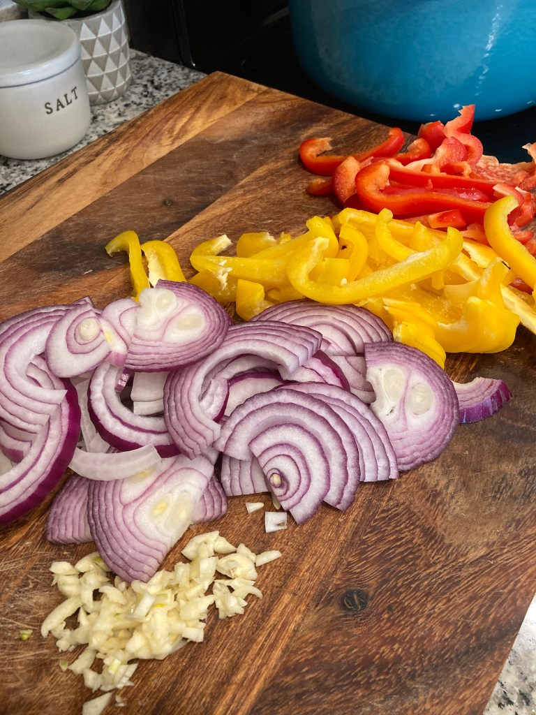 – 2 large sweet peppers (orange, red, or yellow), sliced into 1/4 inch pieces