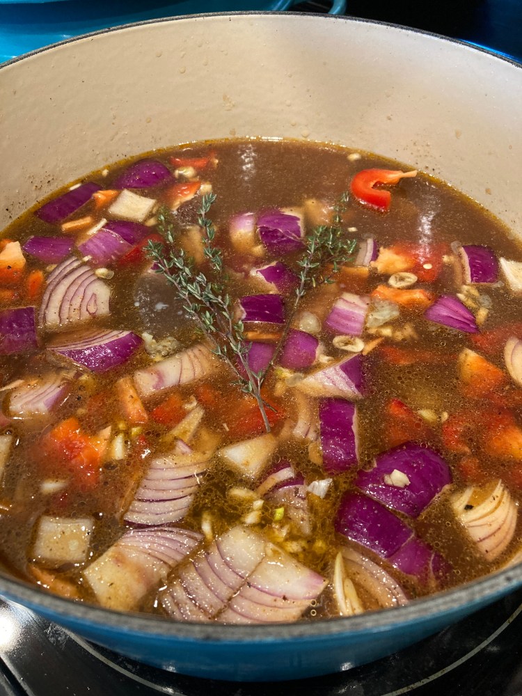 6. When the garlic is fragrant and the mixture is well combined, add the beef back into the pot. Place the onions, peppers, and fresh thyme on top of the beef and pour in all of the beef stock. Stir to combine.