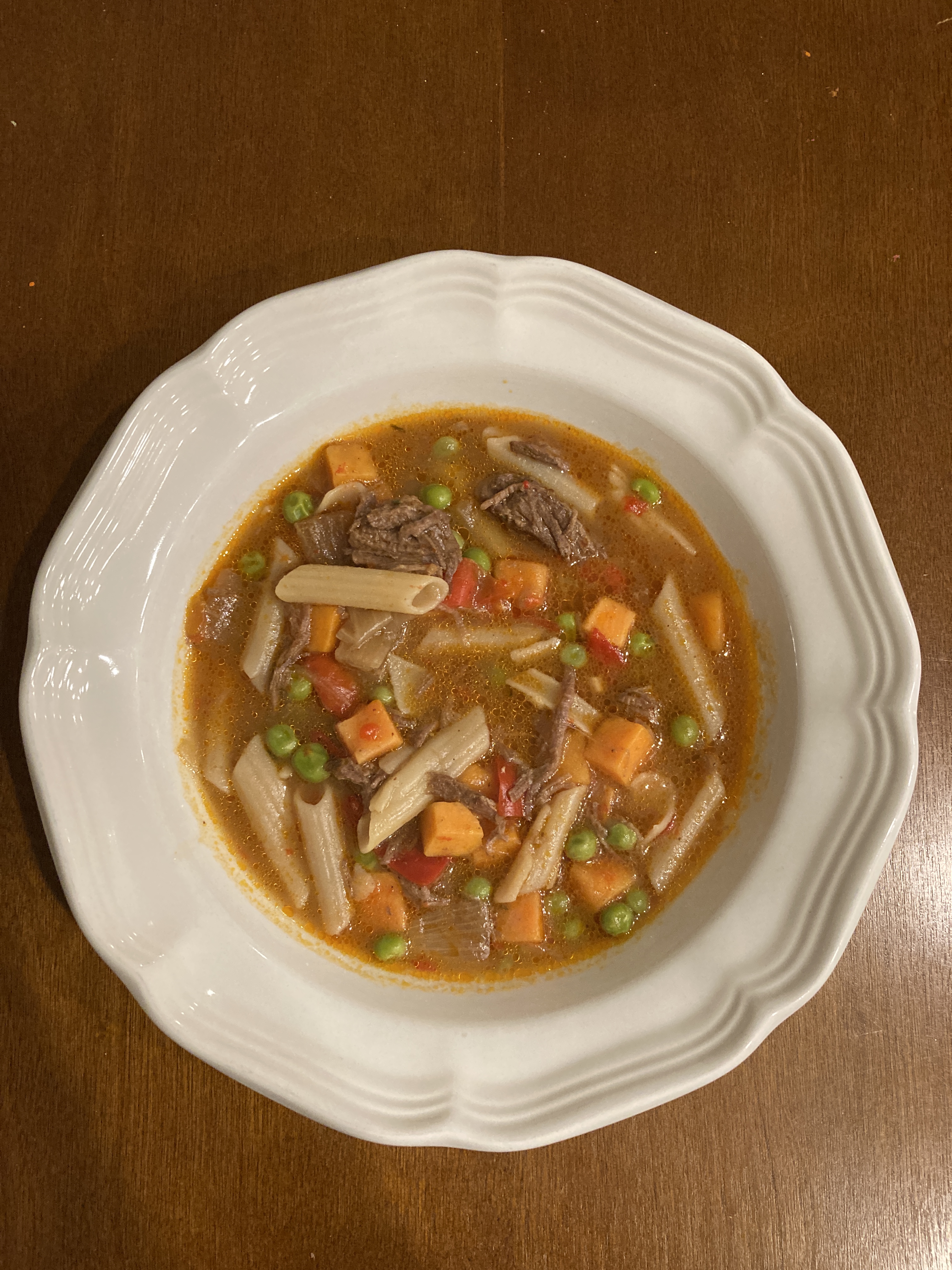 8. When the beef roast is fall-apart-tender, remove it from the pot, shred the beef, and return it to the soup. Add your frozen vegetables, cover, and return the pot to the oven for another 45 minutes to an hour.