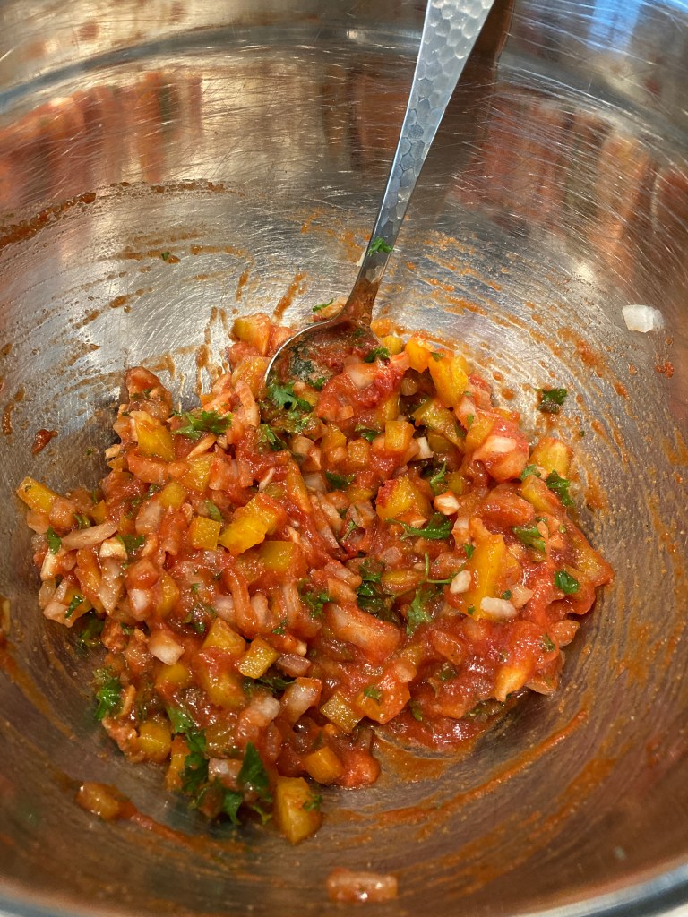 5. Fold in the diced onion, sweet pepper, and garlic.
