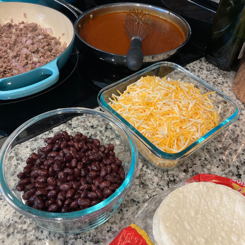 Once you have prepared your sauce, browned your ground beef, and sautéed any raw vegetables, it’s time to line up your assembly line. In your 9×13 pan, begin by spreading a thin layer of sauce across the bottom. This will help to keep your tortillas from sticking to the pan.
