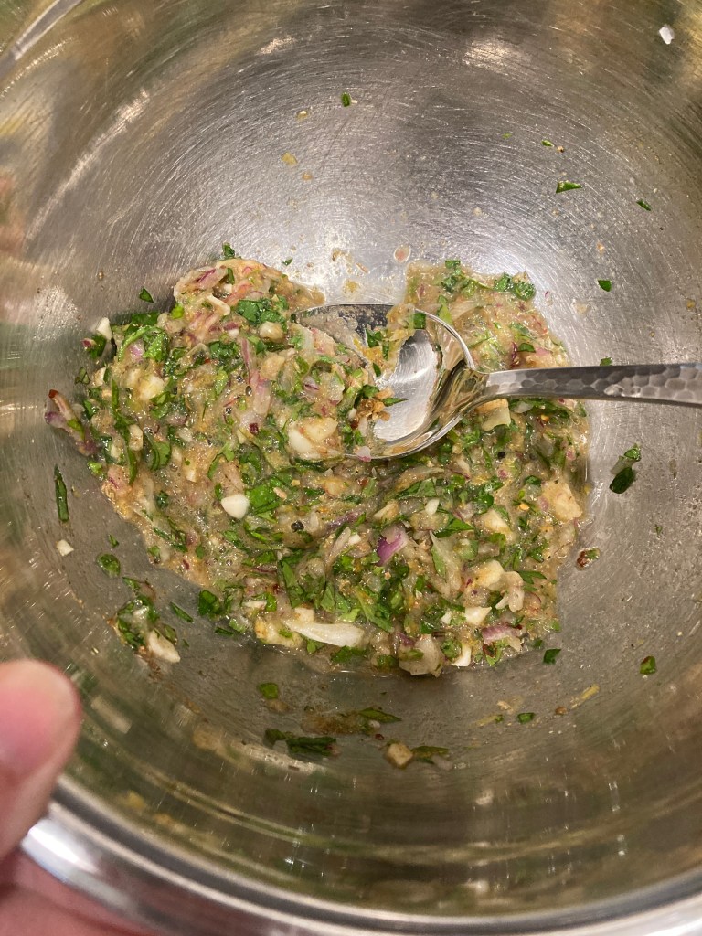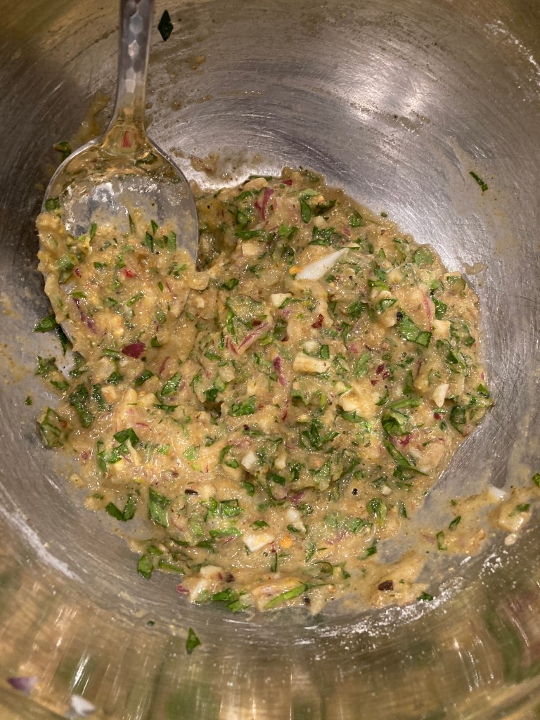4. To the mixing bowl, add the chopped mint and parsley, and the egg. Stir to combine.