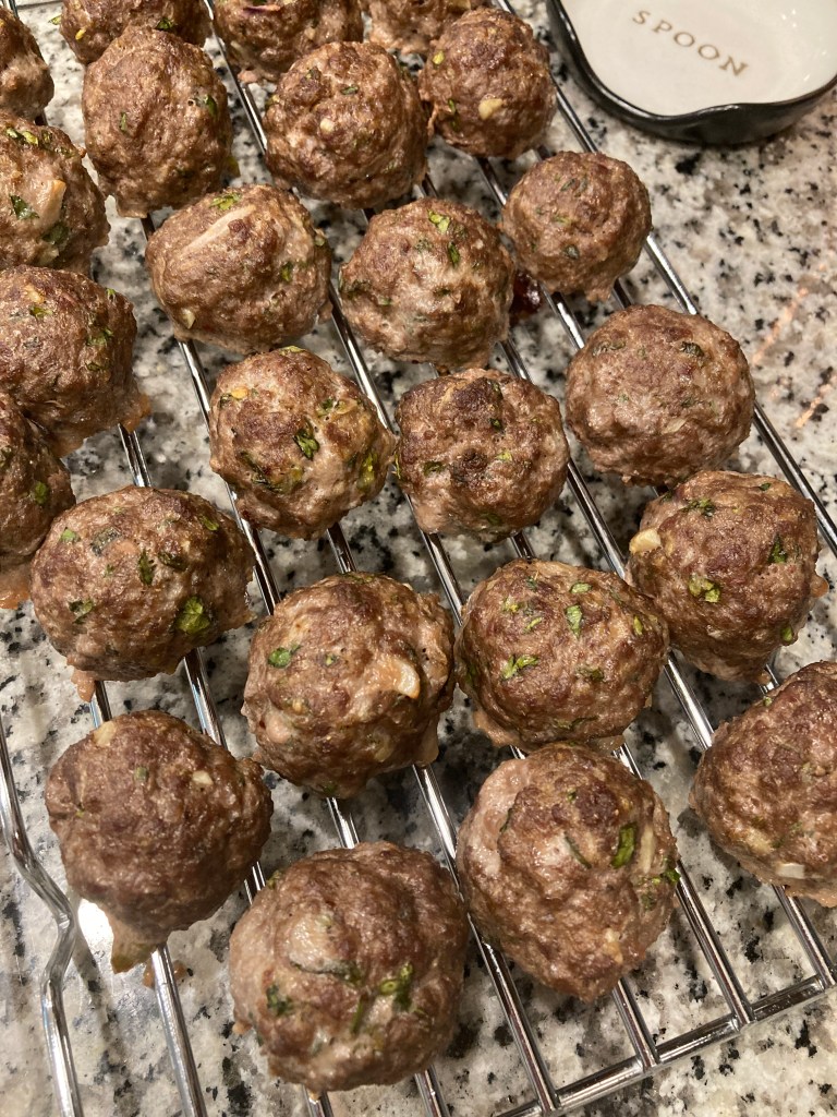 I cook these meatballs at 450 for 18-20 minutes. Before putting the meatballs on the pan, I put down a parchment paper and spread a bit of olive oil across the parchment. This helps to get the bottom of the meatballs nice and crispy, without sticking to the pan. If batch cooking, you can reuse the same oil/parchment for each subsequent batch. Keep the meatballs on the top rack only as the bottom rack will brown eat underneath side of the meatballs before they cook all the way through.