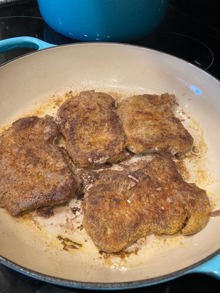 5. Heat a large pan over medium heat. When the pan is hot, add the oil. When the oil is hot, add the steaks to the pan. Sear the steaks for 2-4 minutes each side. This does not cook the steaks all the way through, but creates a brown crust from the flour mixture. If the pan looks dry when it’s time to flip the steaks, add some more oil before flipping. It’s okay if you lose some of the crust when you flip the steaks. It will be incorporated into the gravy.