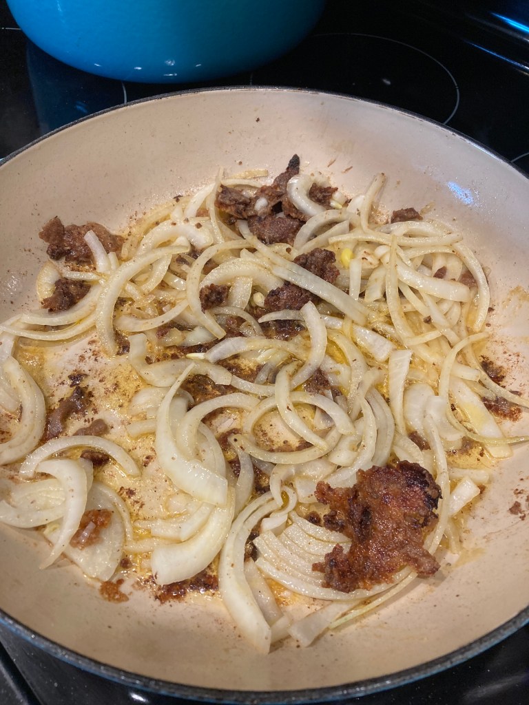 7. To the pan, add the butter (or other cooking fat), and the sliced onion. Sauté the onion. If the pan is dry or too much of the crust has burned to the bottom, pour in a few ounces of the beef stock to deglaze the bottom of the pan.