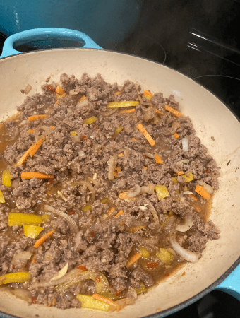 Heat a large pan over medium heat. When the pan is hot, add the sesame oil, ground beef, garlic, onion, and yellow pepper. Chop the beef as it cooks. Stir frequently. When the beef is almost done, add the carrots.
