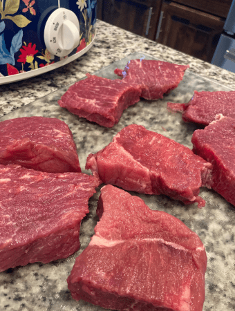 Cut the roast into 1 inch thick steak-like pieces. If present, remove the fat cap while cutting. Pat the pieces dry with a paper towel. Lay the pieces into a crockpot.