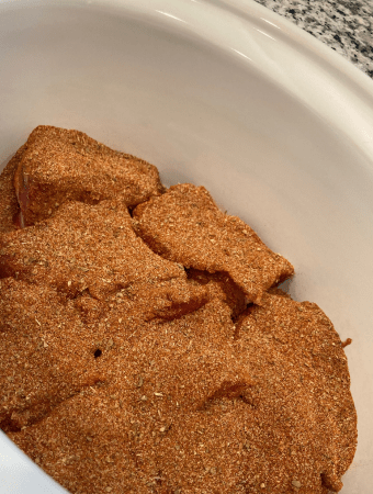 In a separate bowl, mix all of the seasonings from chili powder to white pepper. Once well mixed, pour the spices over the roast in the crockpot. Cover each piece of beef completely.