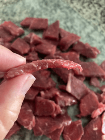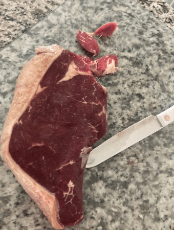 - Pat the steak dry with a paper towel and thinly slice the steak. This is easiest when the steak is still just a bit frozen.