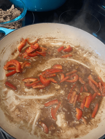 If the sirloin steak is cut very thin, it will cook quickly. As pictured, I only needed to cook the steak for two minutes before removing it from the pan. Once the steak is mostly cooked through and moved to another bowl, simmer the remaining sauce until it reduces by half. Once that is done, add the red pepper and stir. To thicken and/or sweeten the sauce, add a tbsp of orange marmalade and a couple tablespoons of No Soy Sauce. Once well combined, return the steak to the pan and stir to coat the steak in the sticky sweet sauce.