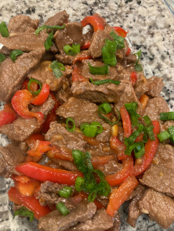 For this recipe, I use a sirloin steak cut into thin strips. Steak is much easier to slice if a bit frozen, so I thaw the steak on the counter for only 1-2 hours before slicing. Once done slicing, I place the steak directly in the marinade for around an hour. (The marinade is made from minced garlic, ground ginger, Sriracha sauce, orange marmalade, No Soy Sauce, and orange juice.) When it’s time to cook the steak, I use tongs to remove the steak from the marinade. Keep whatever sauce sticks to the steak, and discard what is left in the bowl.