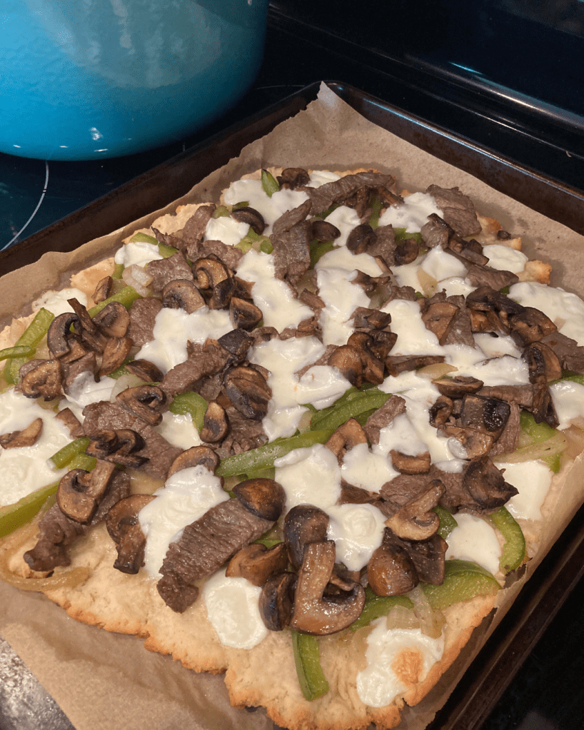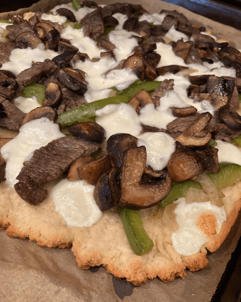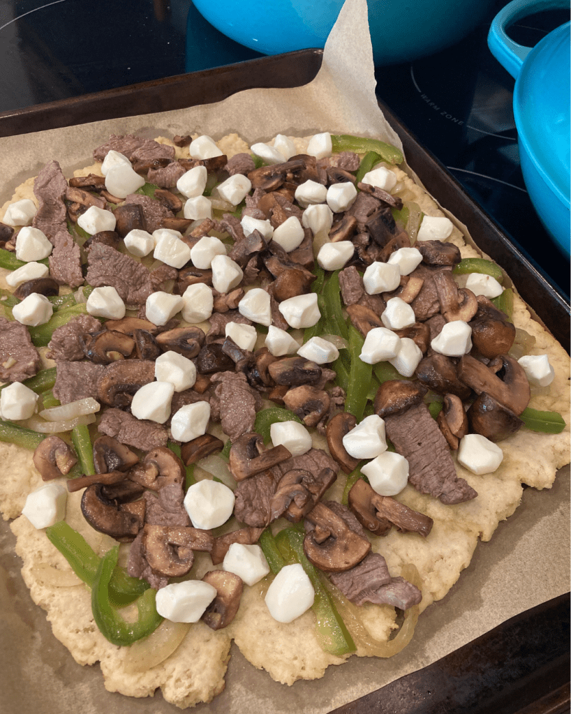 I did not use any sauce on this flatbread. Instead, I drizzled the crust in a layer of olive oil. Then I applied all of the cheesesteak ingredients. You can layer those on as thick as you like. While cheesesteak is traditionally made using provolone cheese, I chose to use mozzarella rounds like these.