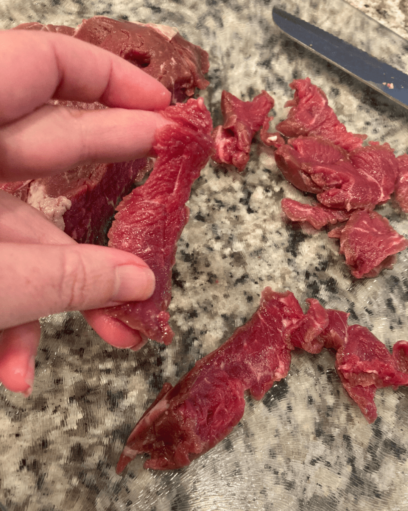 For this recipe, as pictured, I used a ribeye steak. It was packaged as a single steak, just 8/10 of a pound. To turn a ribeye into Philly Cheesesteak, it’s best to achieve a very thin cut. This is hard to do when a steak is fully thawed or cooked first. It’s easiest to do when a steak is raw, and just a bit frozen. In that state, a sharp knife can shave off thin pieces. I try to cut them as thin as I can get them without each piece completely falling apart.