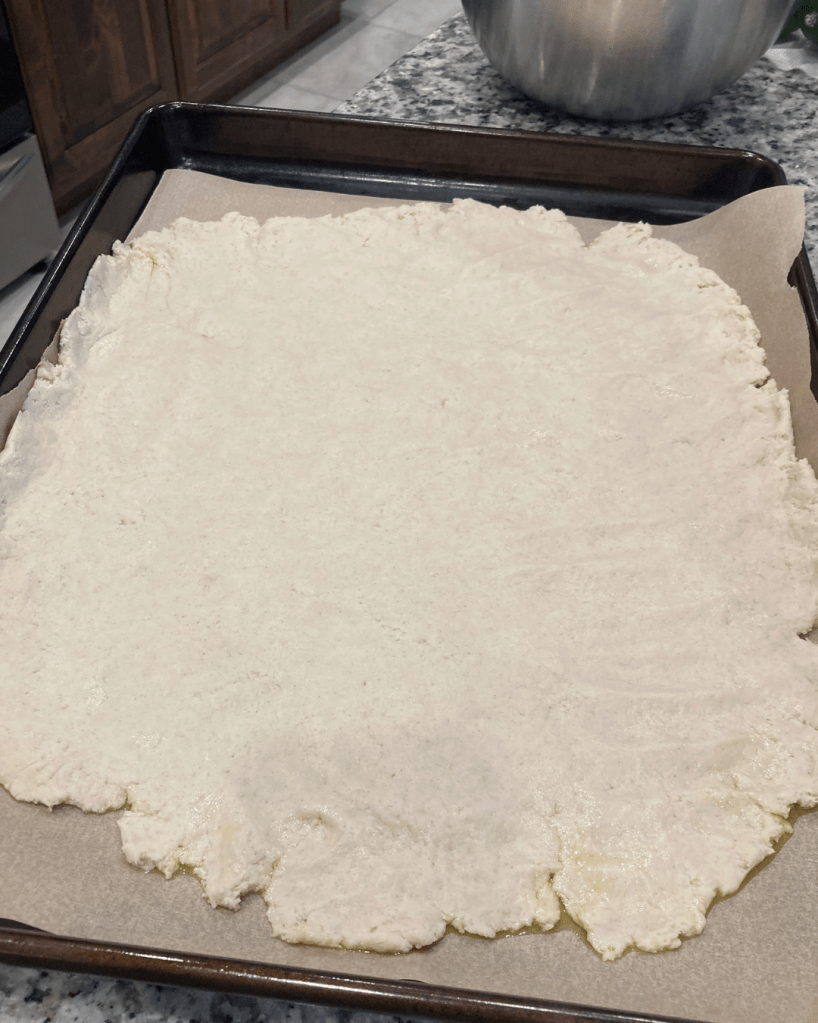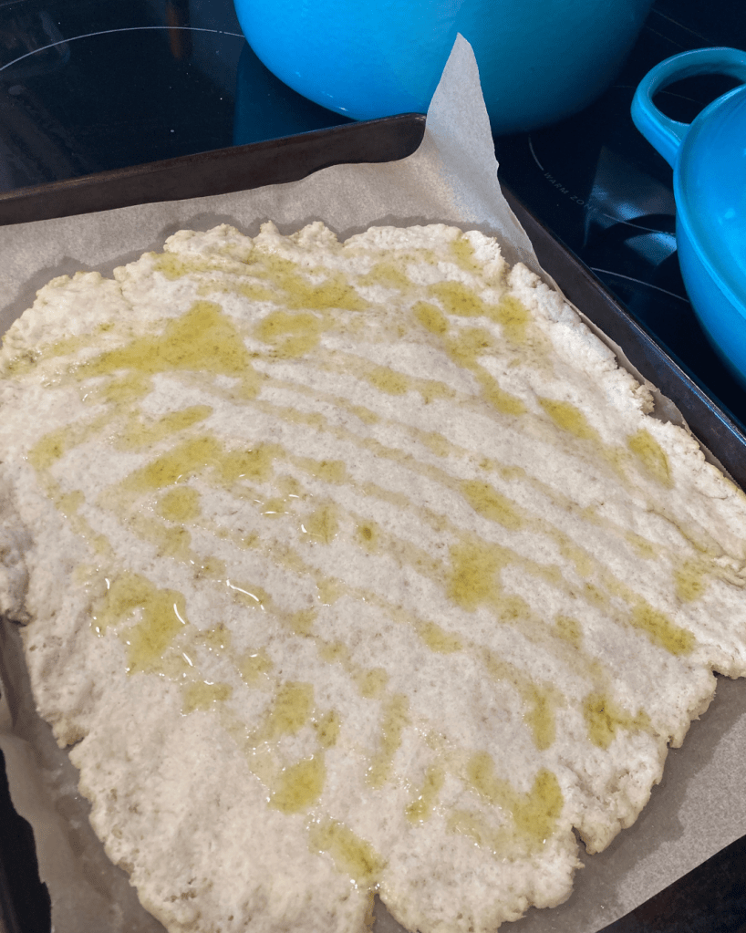 4. When you’re ready to bake the flatbread, set the oven to 425 degrees Fahrenheit. Line a large pan with parchment paper. Spread a thin layer of olive oil over the paper. Place the dough on the oil and push it out from the center until a flat, thin, round or square shape is achieved. Bake the flatbread for 10 minutes. When done, the top will be hardened and the edges may have begun to brown.