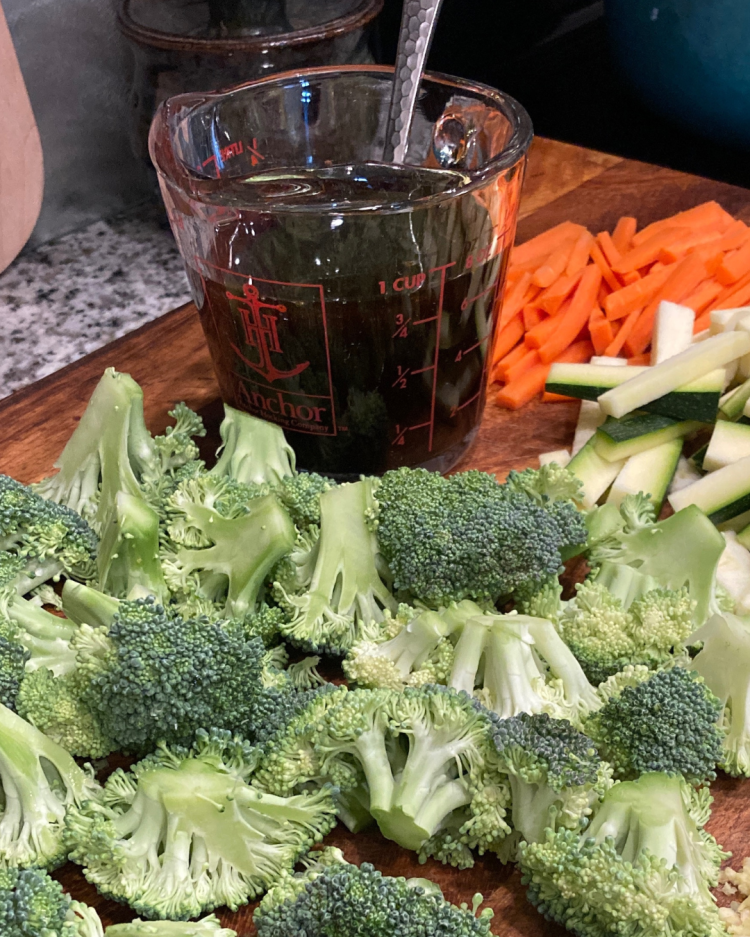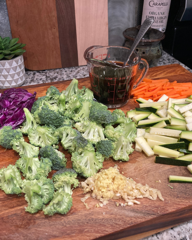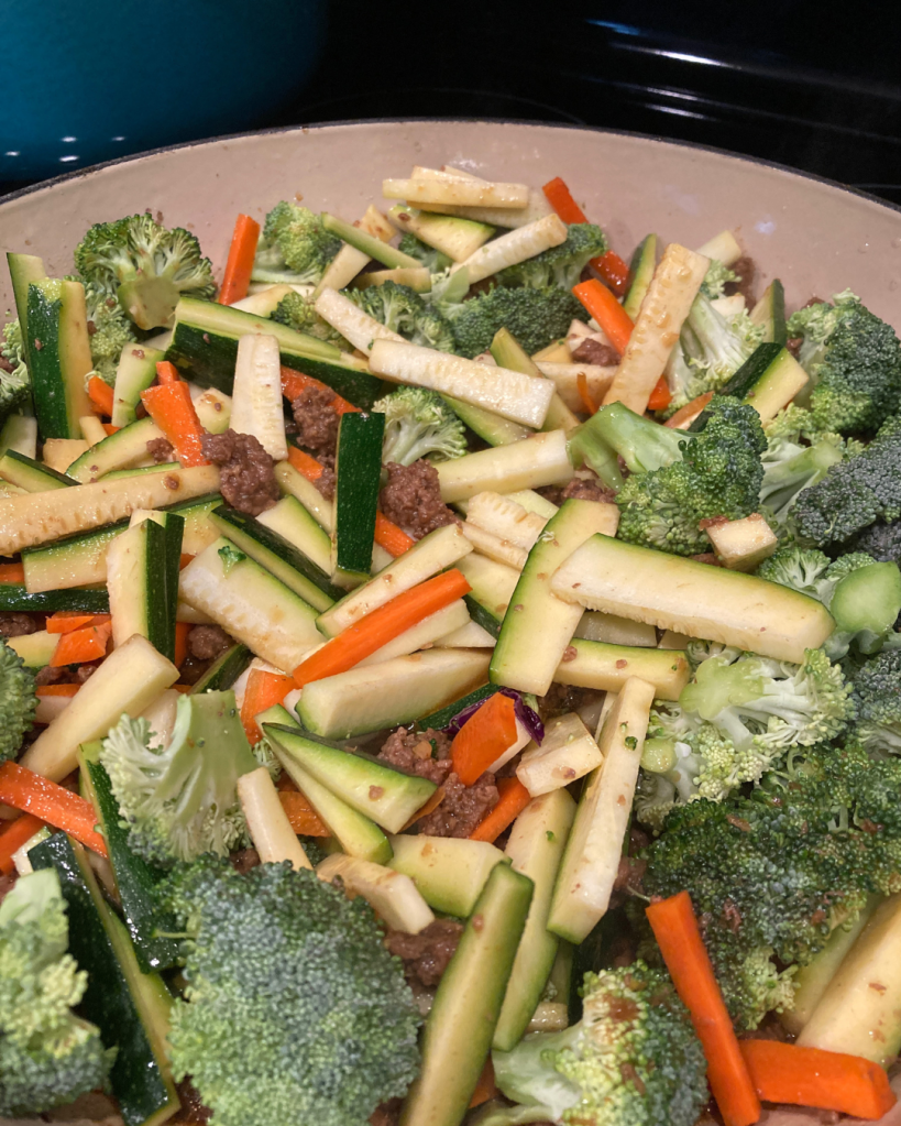 Korean Ground Beef cooks quickly. Be sure to have everything ready to go before you begin the beef. For this recipe, I’m suggesting the use of carrots, broccoli, and zucchini, but you can use what you have or what you like. Whatever you choose, have all cleaned and sliced ahead of cooking. I would also prepare some fresh minced ginger and minced garlic. Both of these greatly add to the flavor profile. Lastly, I advise that you also mix the sauce ingredients ahead of time. Once everything is prepped, you’re ready to begin cooking.